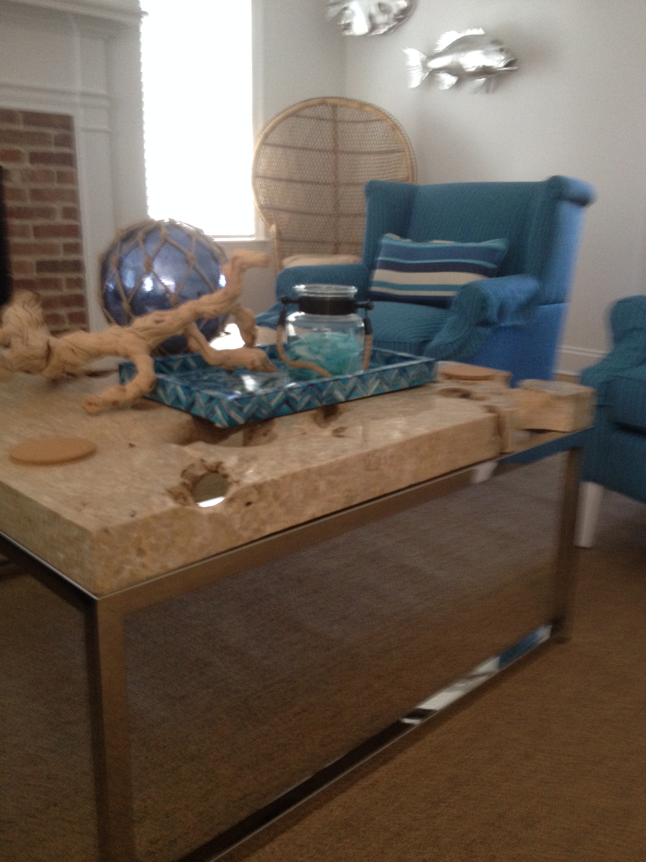 The next pic is of the living room. With tongue in cheek, I placed a coffee table between a sofa and two chairs. The table top is called cheese stone (Swiss, I assume) and has huge natural holes throughout. You need to be careful where you put your glass. It’s part of our sobriety test. The stone weighs about 400 pounds and is on a stainless steel base. The color theme is blue and turquoise and has other surprises on the wall that you’ll see in the next pic.