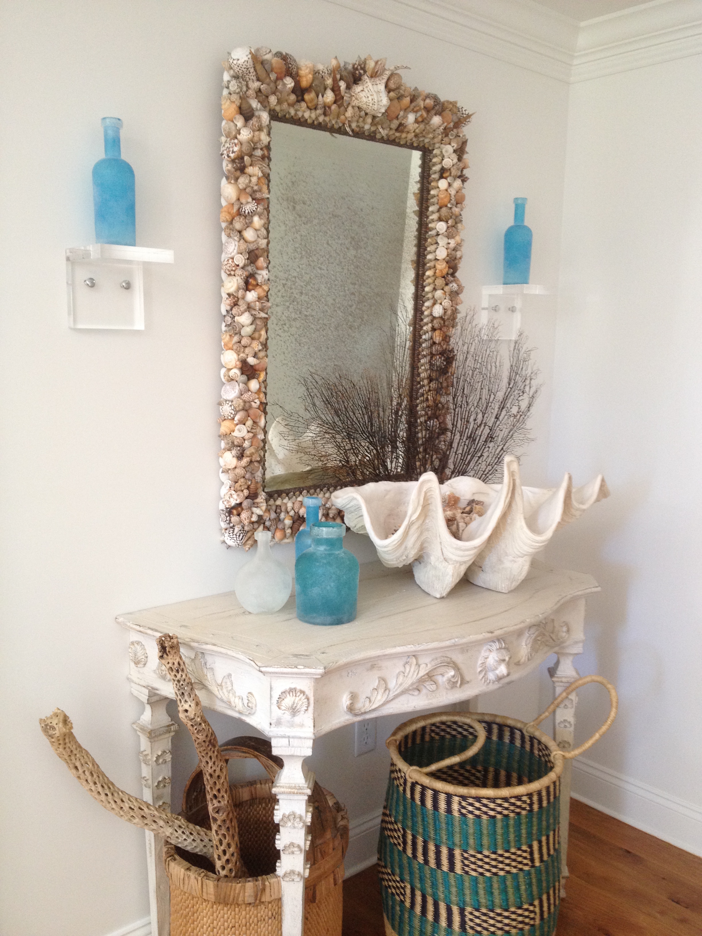Coming into the entry is a rustic white washed table that holds a giant clam shell as well as green and turquoise sea glass bottles. Yes, there are two bottles on the lucite brackets secretly held in place with mounting tape.